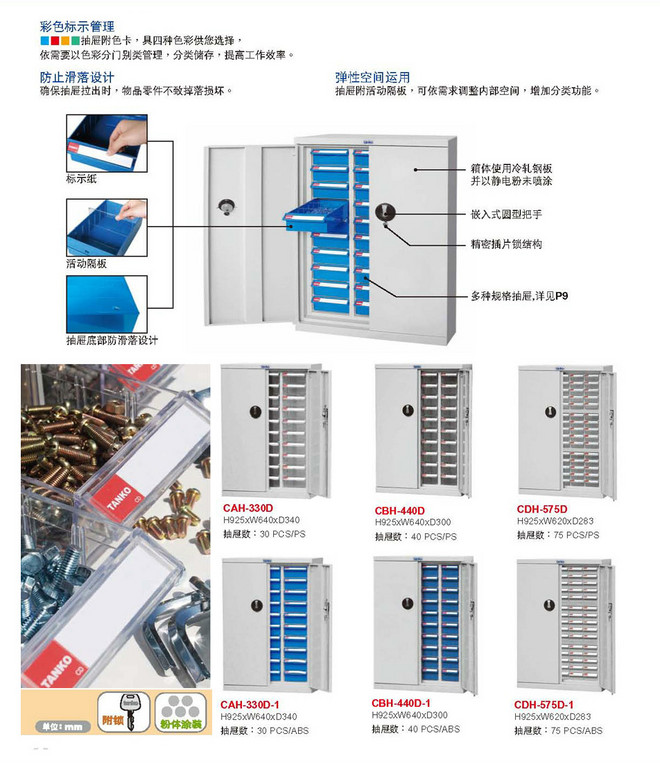 适合工厂 办公室各种小型零件 样品 模具 工具 电子元器件 手机 钥匙等储存分类使用 .色彩管理 抽屉可附彩色标示卡标明屉内存放物品名称及规格 提高效率。